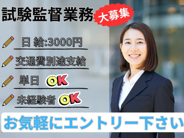 | 給与 | 日給:3,000円 〜 固定残業:なし *欠員要員とは当日スタッフに急な欠員が出た場合に備える要員です。 【欠員が出ない場合】 他のスタッフと同じ時間に集合。スタッフが欠員なく全員揃った時点で業務終了です。 集合時間 7:30 その後解散 日給 3000円 【欠員が出た場合】 当日欠員が出た担務へ入り、その担務時給で試験監督勤務をお願いいたします。 勤務時間 7:30~16:30(休憩1時間) 業務内容 主任監督員/補助監督員 時給 1300円/1200円 |