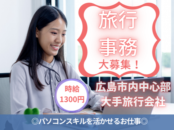【派遣/一般事務/広島市】大手旅行会社での一般事務のお仕事です♪ ◆時給1,300円◆週3日勤務~(応相談)◆ パソコンスキルを活かせるお仕事!◆一般事務経験者大歓迎!